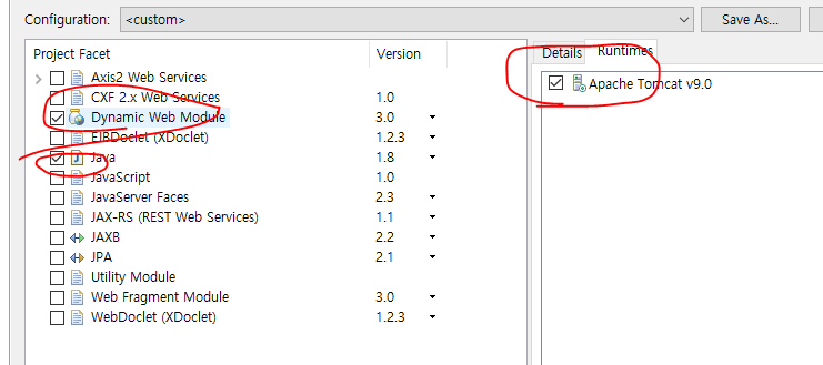 - 프로젝트 우클릭 - properties - Project Facet 클릭