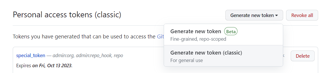 우측 상단의 Generate new token - Generate new token (classic) 선택