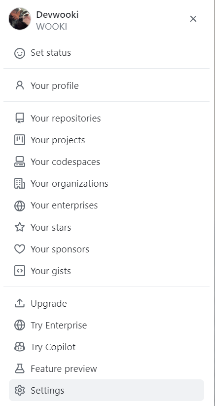 1. GtiHub Personal Access Token 발급하기 - github로 가서 개인 프로필 - ⚙Settings 클릭