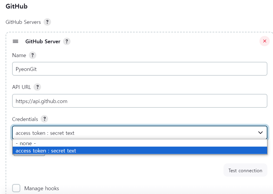 Credentials에서 1번에서 등록한 Secert text를 선택한 뒤 Test Connetion을 눌러 정상적으로 연결되는지 확인한다!